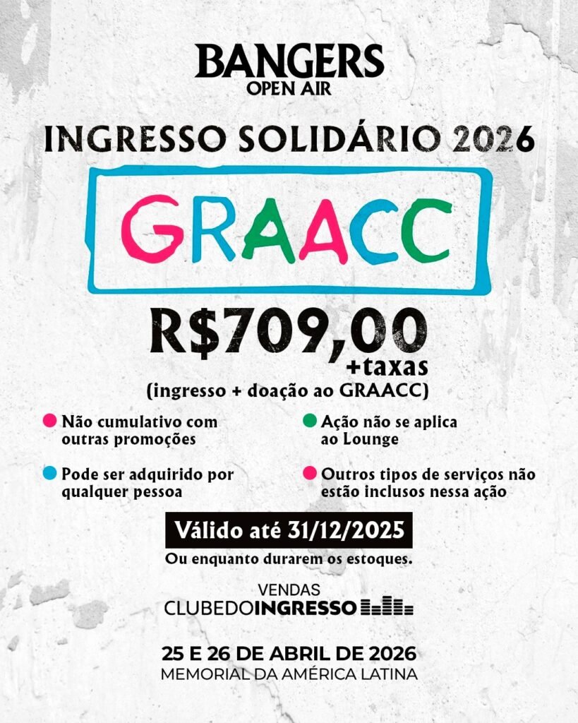 O Bangers Open Air entra na reta final de uma de suas ações mais importantes: o Ingresso Solidário do GRAACC. Faltam poucos dias para o encerramento dessa iniciativa especial, que une música, solidariedade e impacto social real. Se você ainda não garantiu o seu ingresso, este é o momento. Até o dia 31 de dezembro, você pode garantir sua presença no festival e, simultaneamente, contribuir para uma ação que transforma vidas.
