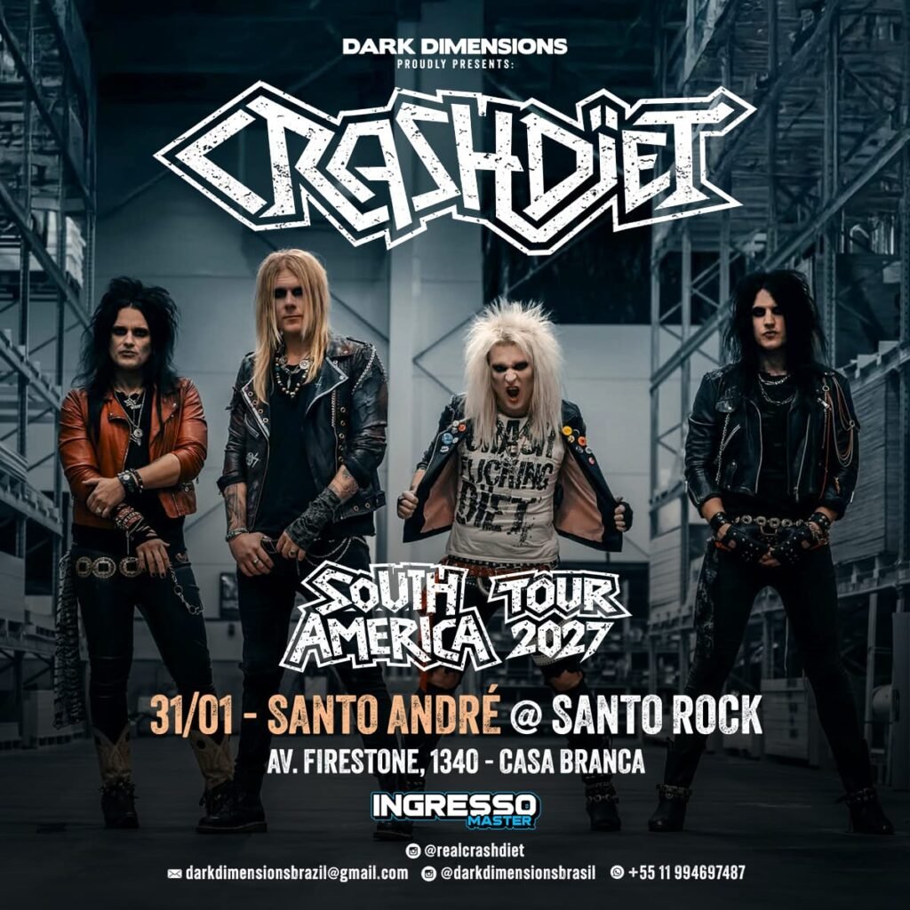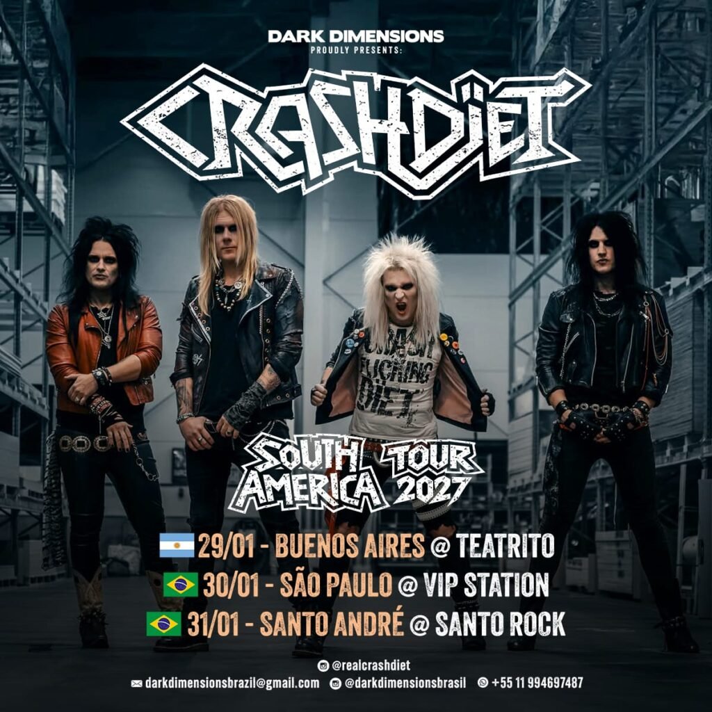 A produtora Dark Dimensions confirma o aguardado retorno dos suecos do Crashdïet ao Brasil para duas apresentações exclusivas em janeiro de 2027. Considerada uma das principais forças do hard/glam/sleaze rock contemporâneo, a banda desembarca no país para shows em São Paulo e no ABC Paulista, prometendo noites carregadas de energia, nostalgia e atitude — marcas registradas de sua trajetória. Os ingressos já estão disponíveis e podem ser adquiridos pelo site da Ingresso Master.