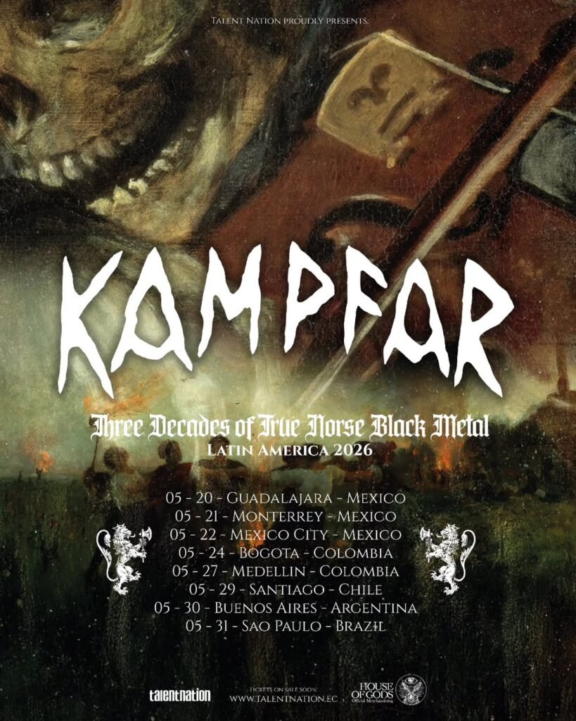 A turnê latino-americana passará por oito cidades, incluindo três datas no México, além de apresentações na Colômbia, Chile, Argentina e Brasil. Em solo brasileiro, o Kampfar se apresenta no dia 31 de maio de 2026, em São Paulo, em show único que promete ser um verdadeiro ritual de celebração à escuridão e à resistência do gênero.